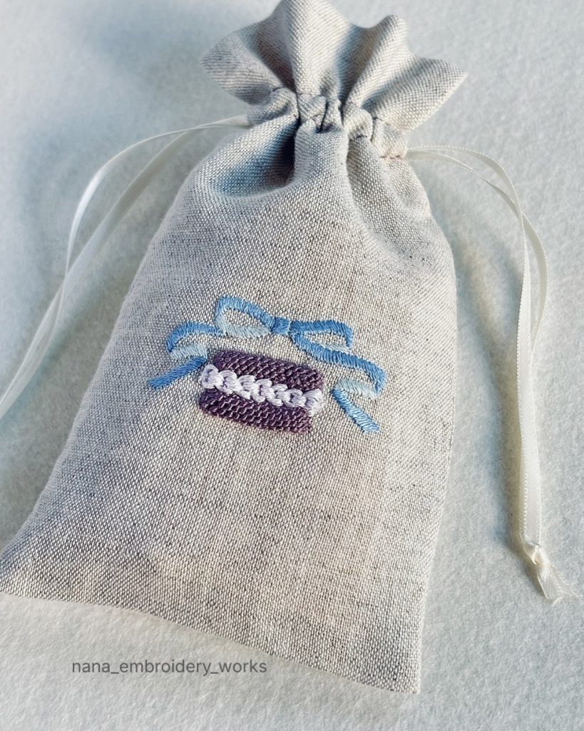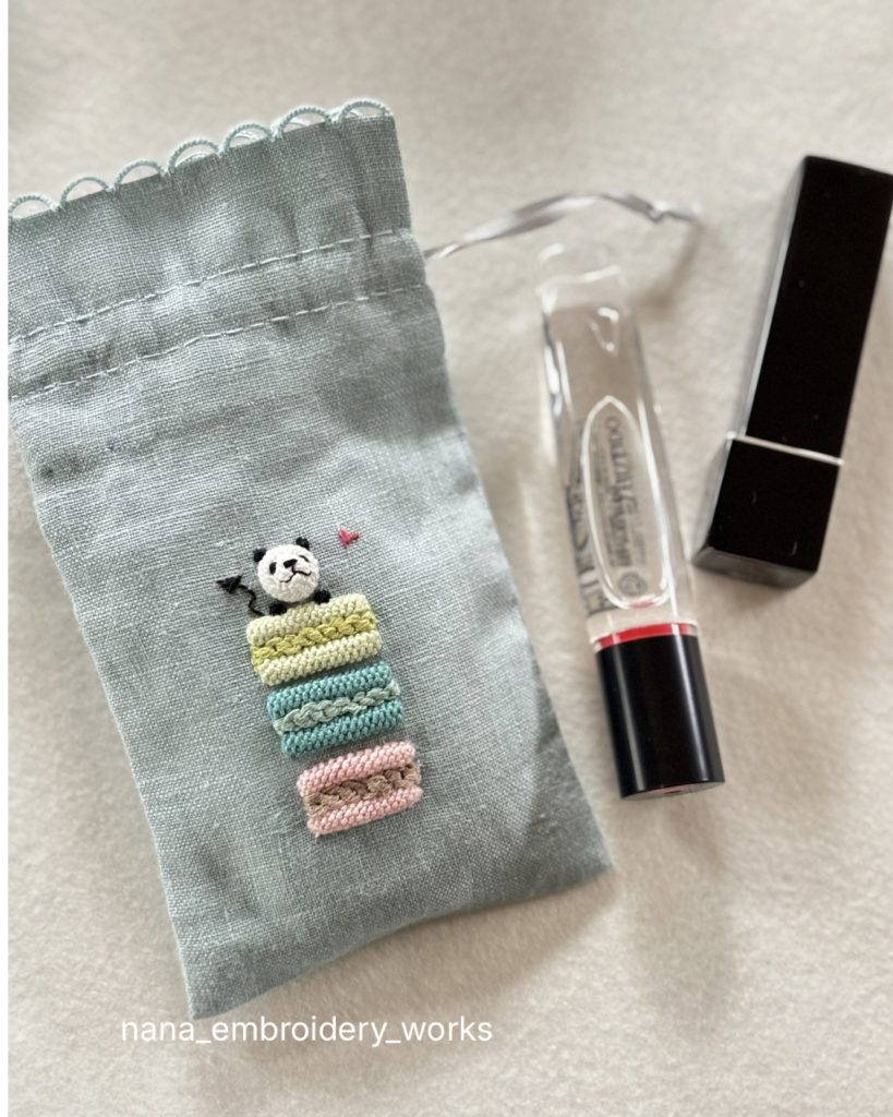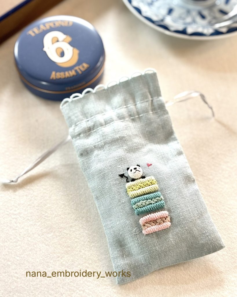 ●マカロンの立体刺繍と手縫いきんちゃく